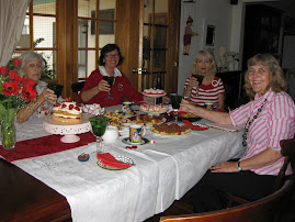 Only our dear friend from Sydney Jenny was missing, again the table was laden with amazing food, the company wonderful, the conversation good for the soul and Lizzie recieved her "Raggy Quilt: a thank you from all of us for her beautiful knitted rugs she made for each of us.